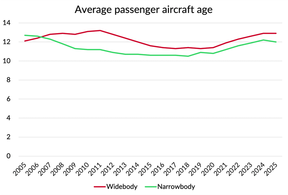 Airlines are holding on to older aircraft as a result, with the average age of the active aircraft fleet climbing by around two years since 2019.
