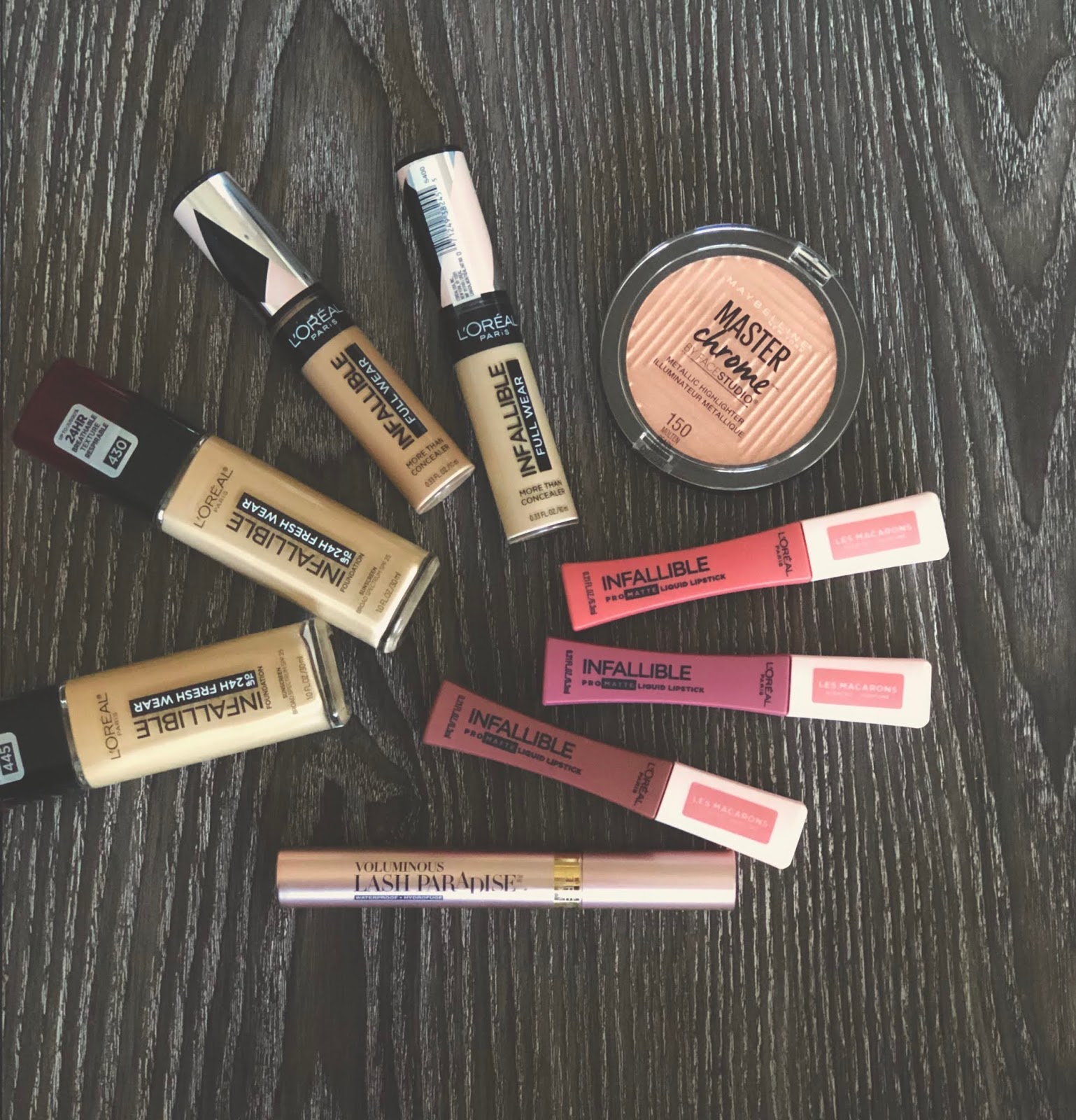 L�oreal Infallible Pro-Matte Les Macarons Scented Liquid Lipsticks�in Mon Caramel, Guava Crush, and Praline de Paris. I don't recommend drinking or eating while wearing these, but I absolutely LOVE the way they look on. I slowly build three layers, using my middle finger to firmly press the formula into my lips as it dries down. It helps the color adhere to the lips, creating texture and volume in a way that looks natural (without having to draw outside the lip lines).