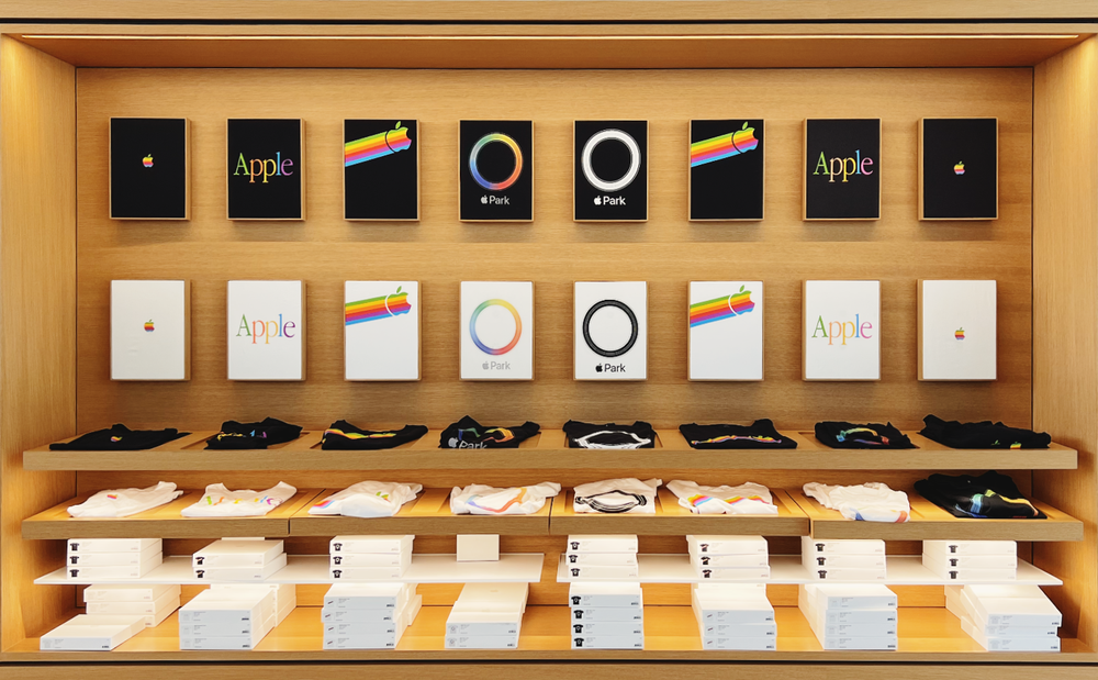 The first display featured four different shirt styles: the Apple Logo, Garamond Apple text, Apple logo with trailing stripes, and the Apple Park ring, all coming either on a black or white tee. All retailed for $40 and were printed to be the same Pima cotton as the shirts at Infinite Loop.