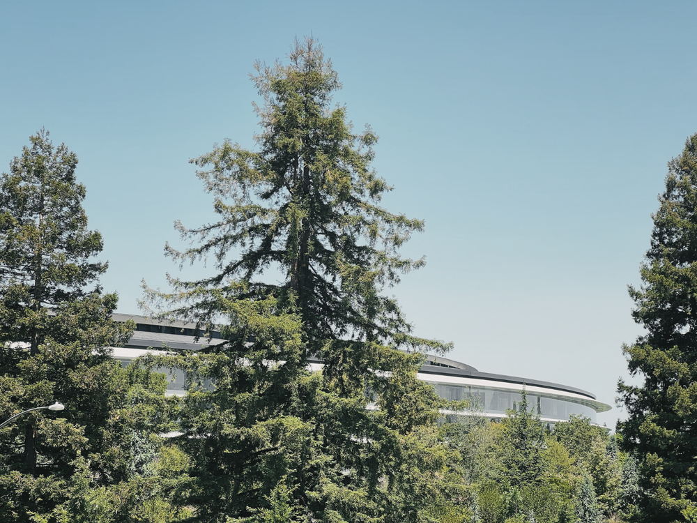 Just the upper floor of the SE section of Apple Park pokes above the shrubbery surrounding the campus. The iPhone's 3x optical zoom wasn't powerful enough for me to glimpse all the secrets they were storing up in that corner office.