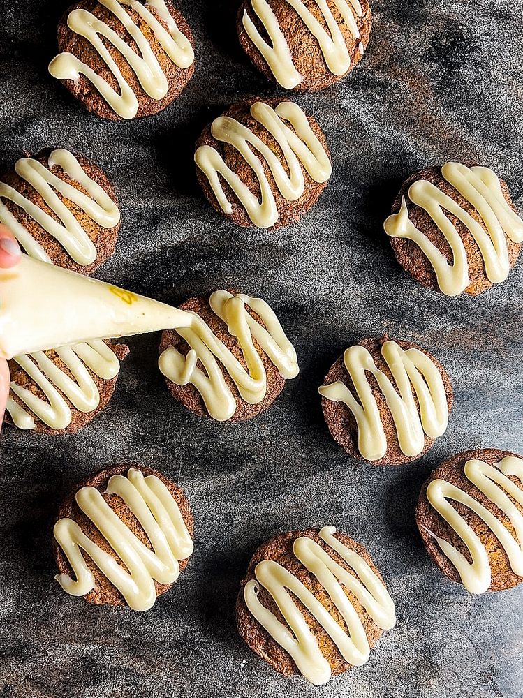 Once these cool, I always finish them off with a big drizzle of cream cheese glaze. All it takes is a softened brick of cream cheese, a hefty cup and a half of powdered sugar, and a big tablespoon of vanilla extract. I whip that all together and spread it on top of every single one of those lovely muffins!