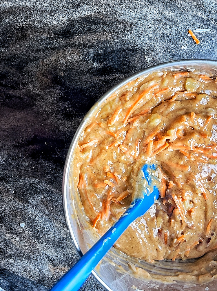 After the batter is combined, I mix in all my favorite finishings. Crushed pineapple, shredded coconut, chopped pecans, and of course, shredded carrots are in the mix! I carefully blend those in by hand so the batter doesn�t get over mixed. Then, I drizzle some of that Ol�ico Safflower oil onto a paper towel and grease my muffin tin with that flavorless, odorless oil, so my muffins fall right out of the pan when they�re baked and cooled.