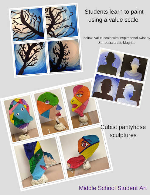 I take a lot of inspiration from our awesome online art community.� I will try to give credit to the teachers I saw these lessons from!� Some are recent work I've done with small groups of students and others are from a few years back.� What I enjoy about all of these lessons is the chance to integrate other academic concepts into the process!�