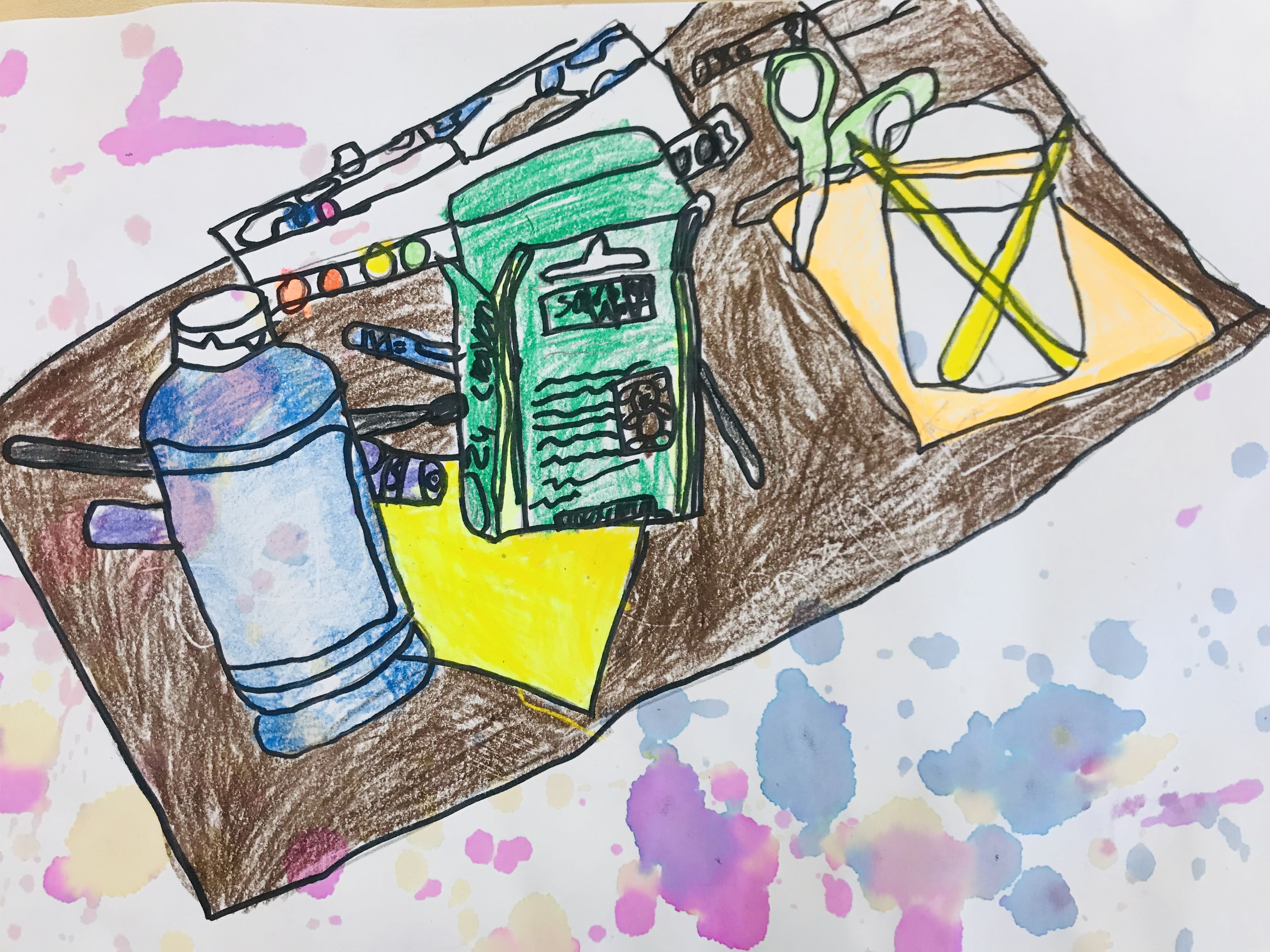 We began by talking about still life and the reason artists might create a still life. I tried to point out simple objects they might have at home that they could set up to draw on their own.� We also covered the many media that still life can be created in and viewed some examples in these various media.Because of behavior factors in the classes, we used simple tools to add color.� It wasn�t my original plan, but it worked out just fine and it goes to show that we have many other factors to consider in planning our lessons than just aesthetics.� Students had access to colored and black sharpie markers and twistable crayons. The bright, bold colors really dressed up even the simplest drawing.