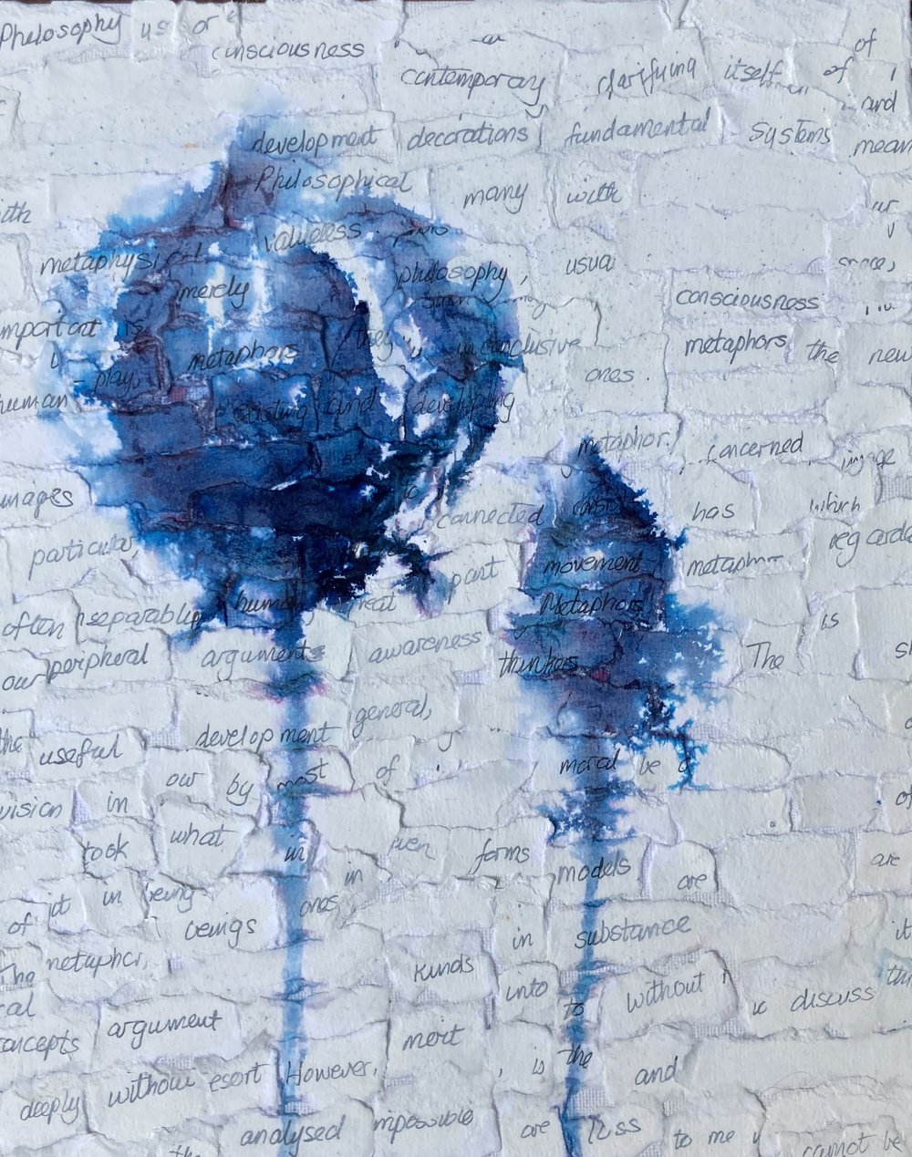 As I get to understand what a new material can do, a dialogue starts with earlier work as I think back to past paintings and processes for possible new ways to work. I wondered what would happen on a disrupted surface, and over handwriting. AT the top of this post is the outcome. I wrote out the opening words from and Iris Murdoch�s text (The Sovereignty of Good Over Other Concepts, 1967) on to thick watercolour paper, ripped them and glued them randomly to construct an almost 3d surface. Then I experimentied with Midnight Blue ink spreading on this disrupted surface. This step draws on the word-collaging technique I developed 6 years ago in Berlin Notes in the Dark. That technique was used on a larger scale in the series Other People. In those paintings, pairs or groups of people engaged in unheard dialogue, their individual stance and the space between them conveying something of their relationship. You can see both series on this page by scrolling down.