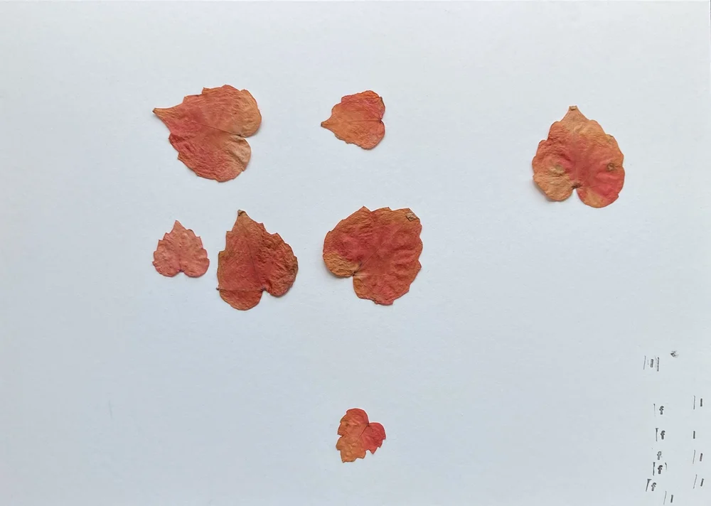 We found the leaves pressed between two pieces of kitchen roll inside a book that I left here in NZ in October 2020. I have no memory of their collecting, pressing, laying aside. Refound, they are making new memories...