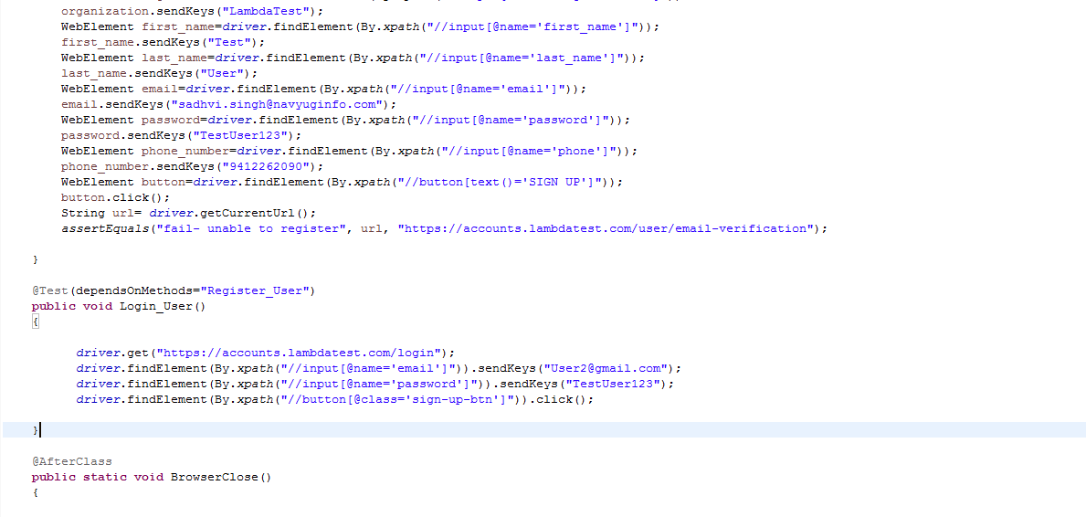 in with valid credentials and then another method ensuring the user is not