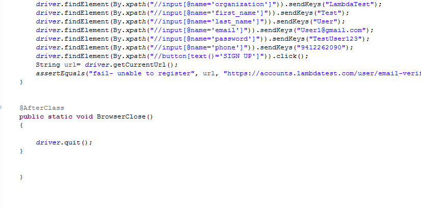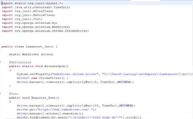 The above script opens the browser with https://www.lambdatest.com/ and clicks on �free sign up� button to register. Post register, the script will check the URL it is redirected to in order to ensure successful registration. We have used two classes of�JUnit�one is Annotations class and the other Assertions.
