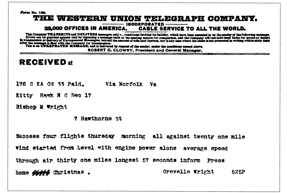 December 17, 1903: This telegram was sent by Orville Wright to his father on December 17, 1903, the day of the Wright brothers historic...