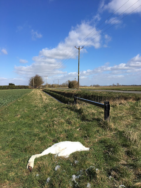 One of the dead Mute Swans below the offending wires, which have subsequently been fitted with hi-viz deflectors. Hopefully no more scenes like this.