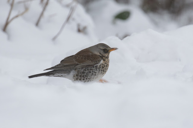 Today has been utterly bitter. Snow is drifting, covering and closing even the main roads. In some places it has drifted up to a metre deep - quite astonishing to see in Britain, particularly on the first day of March. I've been busy working and haven't had chance to get out birding, although I've been watching a male Reed Bunting busy around mum's feeders for much of the day and then a Fieldfare came in late afternoon to feed on the apples we put out.
