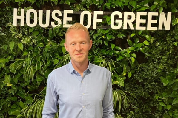 Magnus H�jberg Mernild in front of a sign at the offices of State of Green, a partnership between the Danish government and clean energy businesses. [Photo: Dan Gearino/Inside Climate News]