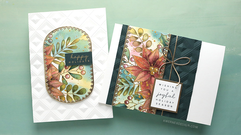 Happy Friday! Today is Day 7 of the Holiday Card Series. For these cards, I wanted to try out one of Altenew’s Watercolor Compacts. I swatched both of them (Deep Muse and Moody Brights), but eventually decided to use the Deep Muse palette. I watercolored my Winter Greenery Background, and then cut the painting in half to create two separate cards. The greetings were stamped using the Winter Greenery Stamp Set.