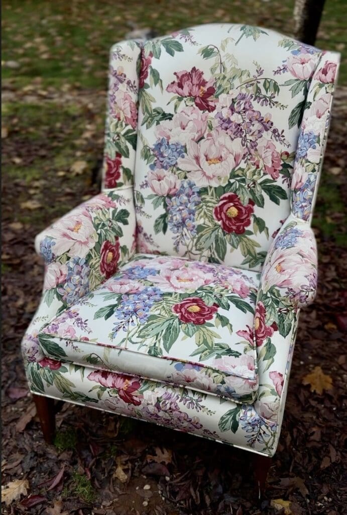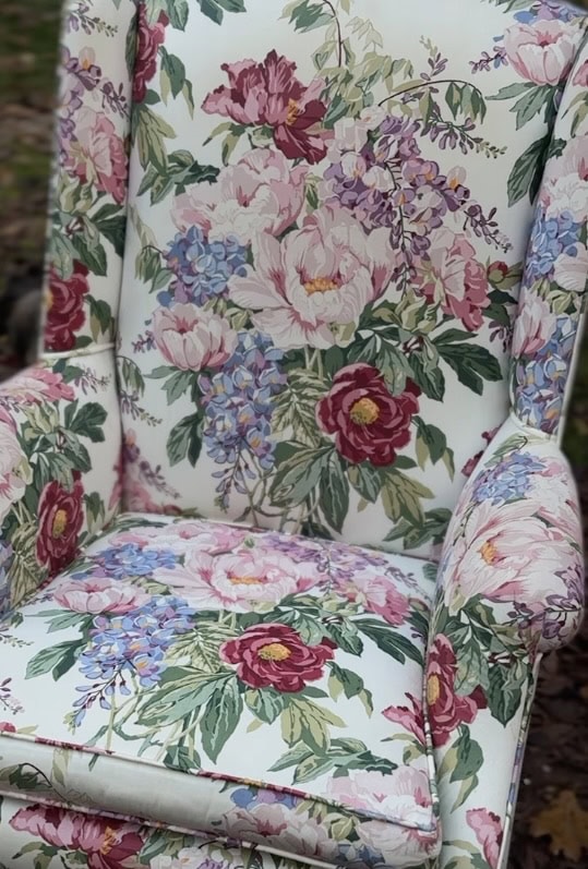 From the charming wing back style to the wood legs and vintage upholstery. Such a sweet one! I found this on Marketplace (surprise!) and my husband picked it up for me. It was actually a seller who I had bought from before- he buys leftovers from yard sales, storage unit close outs, etc. and resells on marketplace. He held the chair for us until my husband could get there – so I actually didn’t see it in person until it arrived home.