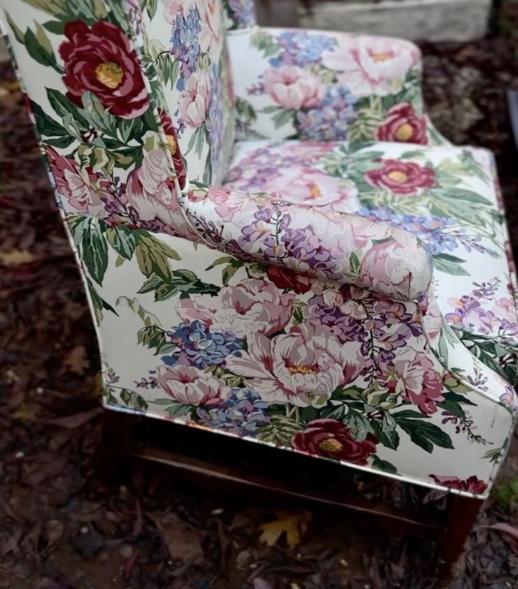 Sometimes you find something that just plain talks to you. And in vintage floral chintz nonetheless. Today sharing a peek at a new to me treasure that I couldn’t leave behind – to be honest, I had no idea where it would land in our home but it wouldn’t stop talking to me. I often bring home chairs or other pieces for a specific photo or styling for a photography job-so it is not unusual that I don’t always know where things will go. Sometimes they land here for a bit, are in a photo project and stay- or go to a new home. This one will be in a photograph project- but after that- at this point, I have no idea where it might end up. Sharing some quick phone snaps today.