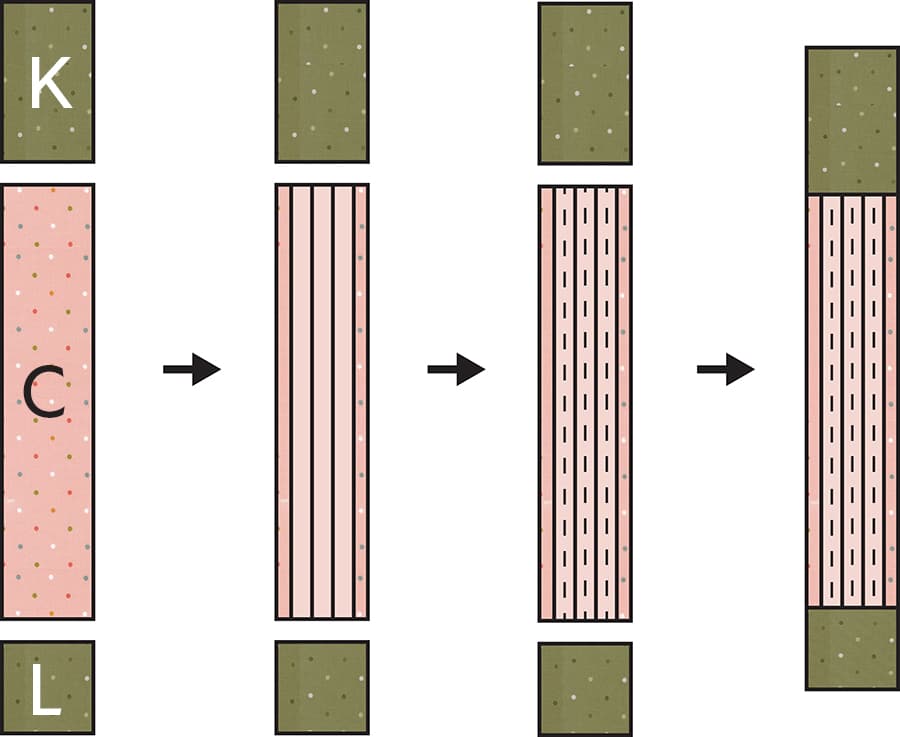 It starts with the K/C/L fabric pieces arranged in a column > (3) rows of Chenille-It (double layers) arranged onto the pink fabric rectangle, leaving 1/4″ at the sides > stitching down the center of each Chenille-It row > Sewing the fabric units into their column.