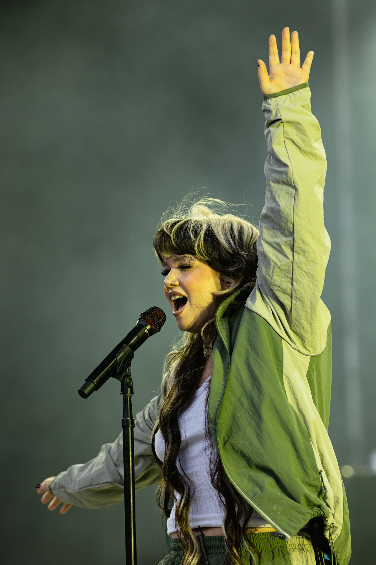Maude Latour was a mid-day firecracker. Dressed head to toe in silver sequins with rainbow tinsel throughout her hair, her joy radiated on and off stage. All Things Go is a break for her in the midst of her supporting dates on Alex Warren’s tour, and this afternoon was celebratory in nature with the deluxe version of her album, Sugar Water, having come out that day.