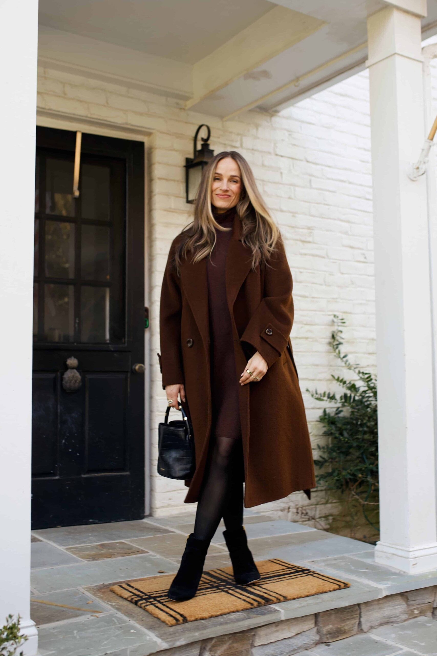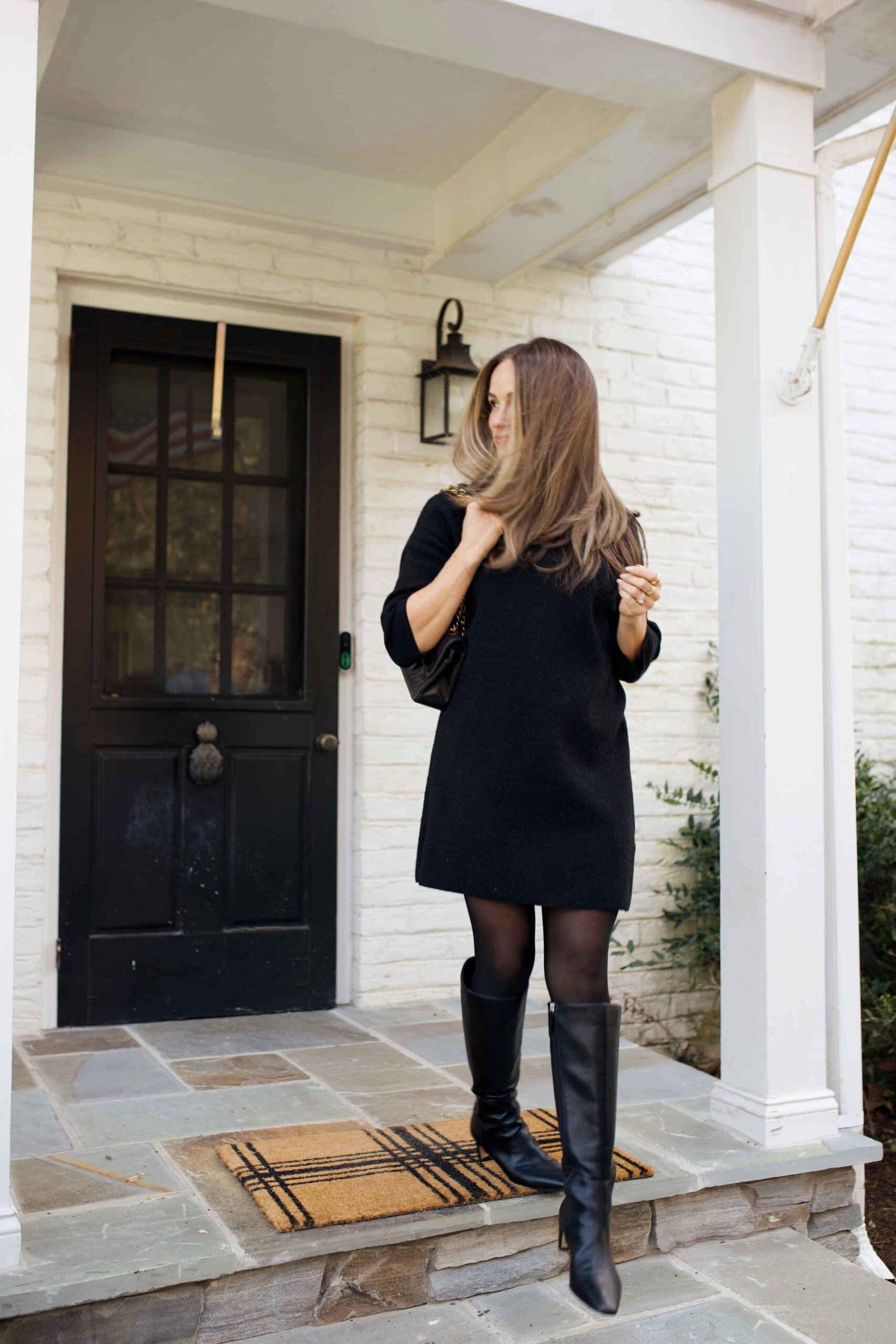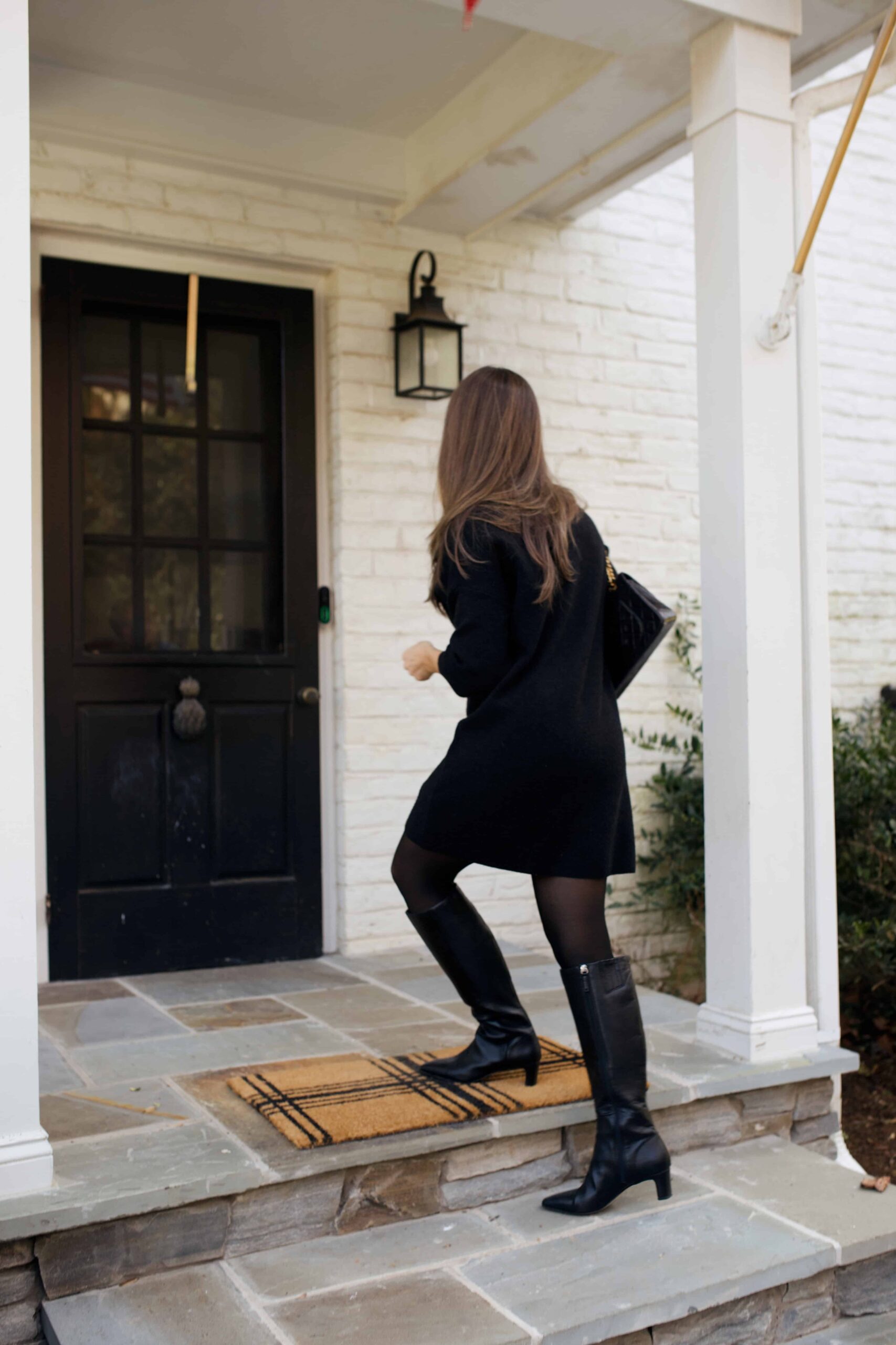 - I’m wearing these Sam Edelman tall black heeled boots with the same mini sweater dress from Tuckernuck, and opaque tights. If I were heading out to dinner, I’d take this wool coat with me for warmth and easy winter outfit that feels polished but not overly formal.