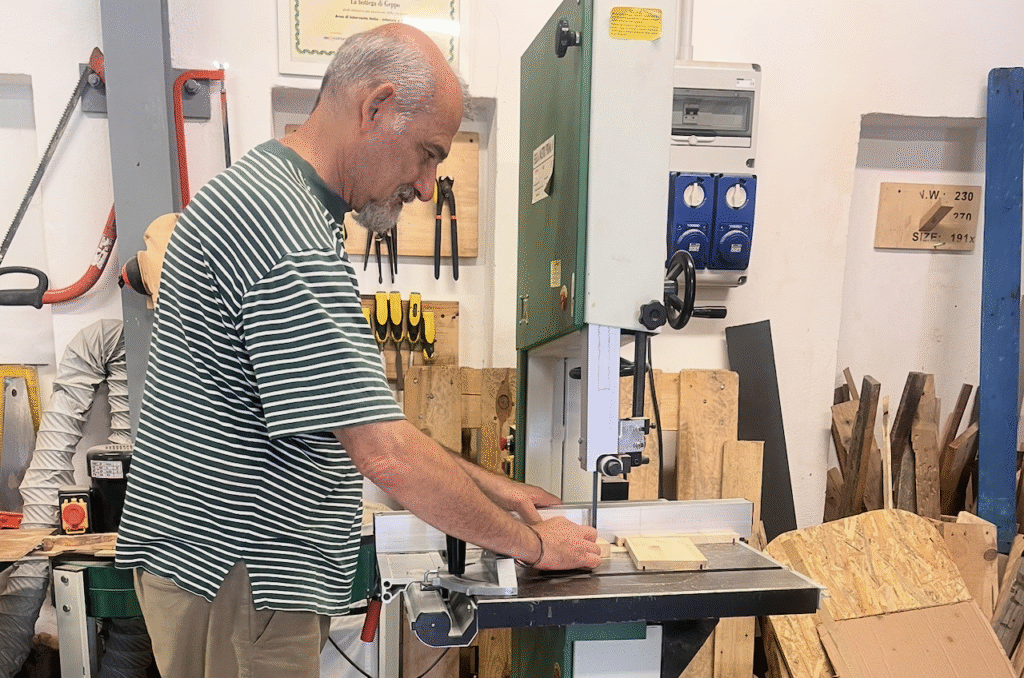 In a workshop in Milan, in northern Italy, Enrico Allorto, a master craftsperson known as a luthier, is bent over a bandsaw, slicing through a plank of wood salvaged from an abandoned migrant boat. At a workbench nearby, Nicolae, an inmate from Opera high security prison, is gluing narrow slats of the recycled timber together. Another former prisoner out on probation stands watching.