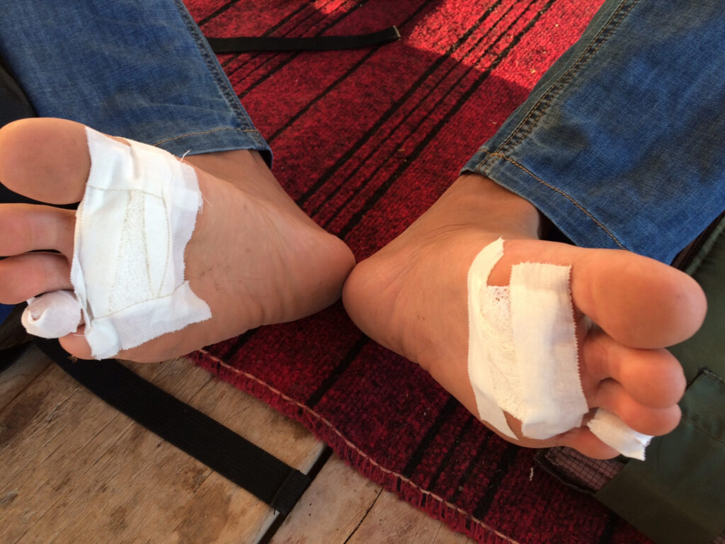 A chronic malady on a walk around the world: blisters. These are the battered feet of one of Paul Salopek’s walking partners in Uzbekistan.Paul Salopek/National Geographic, Out of Eden Walk